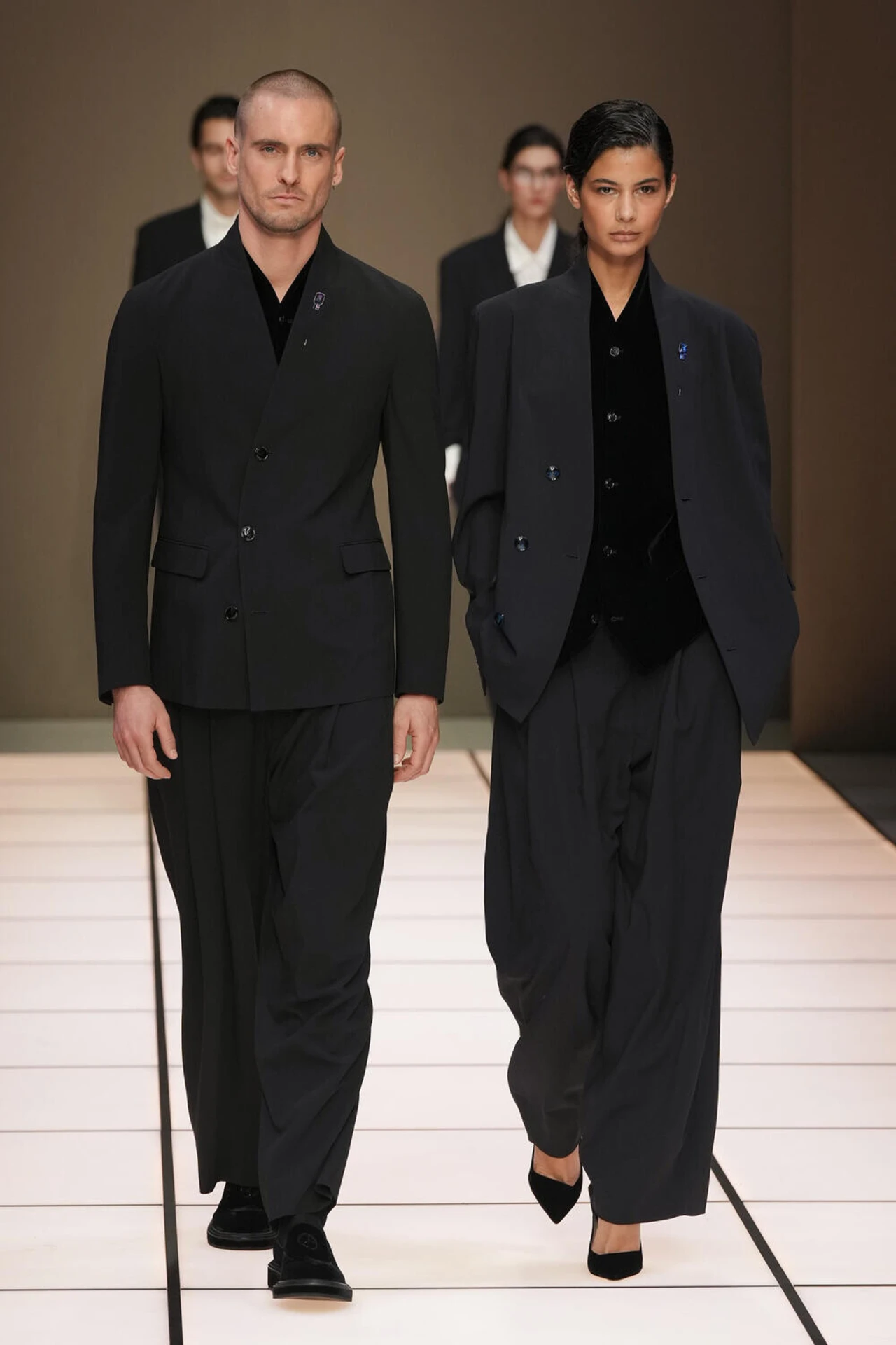 That matters because Armani’s authority has long lived in understatement, in the famously tempered spectrum some call greige. The shift away from that signature neutrality, even if partial, reads like a decision. A house in transition can either overexplain itself, or it can let a lapis velvet jacket do the talking.