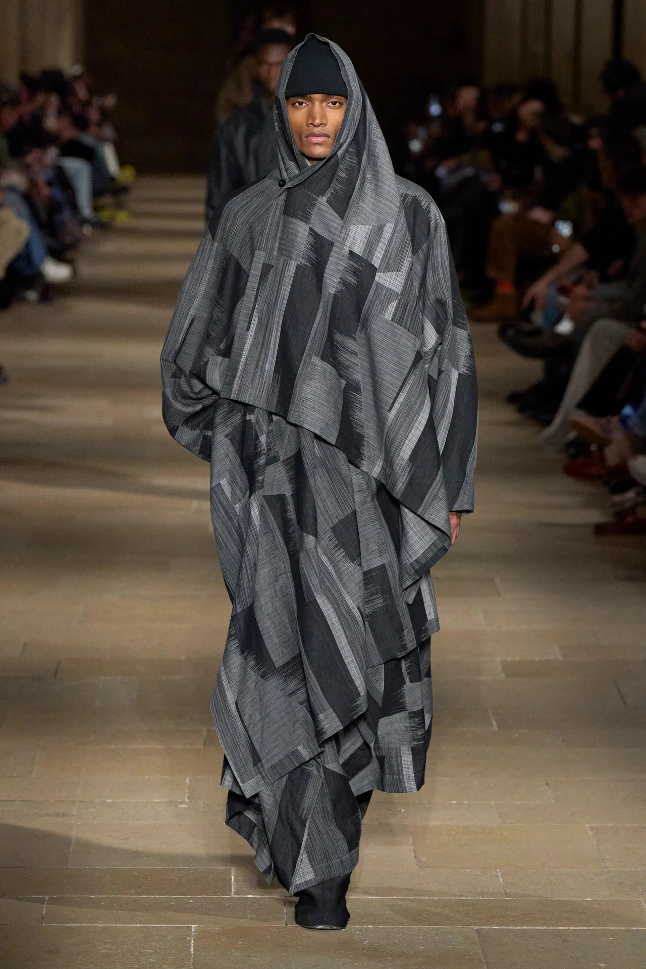 IM MEN titled the collection Formless Form, a phrase that sounds like a riddle until you watch it solved in real time. The starting point was not a heroic silhouette but a piece of cloth, the Miyake lineage premise that fabric is not a problem to tame; it is a partner to negotiate with. The show opened on a bodily thought, those liminal hours of dawn and dusk, when something begins and something ends, and posture changes without permission.